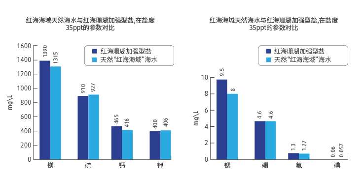 红海公司实验室进行的原创研究证明,在一个闭合的水族箱系统中,基本元素:钙,镁, 碳酸盐(碱度)的特定比例是维持珊瑚生命力以及健康的霰石骨架构建过程所必不可少的。当把基本元素的含量水平提高到自然状态之上时,维持这个特定的比例就更为重要。