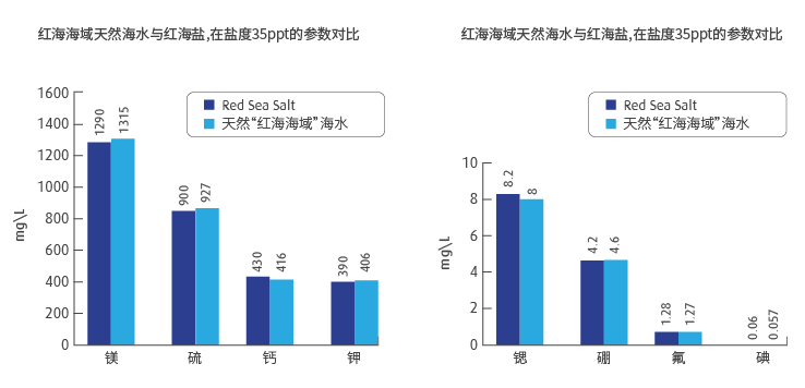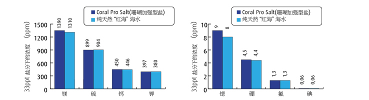 红海公司实验室进行的原创研究证明,在一个闭合的水族箱系统中,基本元素:钙,镁, 碳酸盐(碱度)的特定比例是维持珊瑚生命力以及健康的霰石骨架构建过程中必不可少 的。当把基本元素的含量水平提高到自然状态之上时,维持这个特定的比例就更为重要。