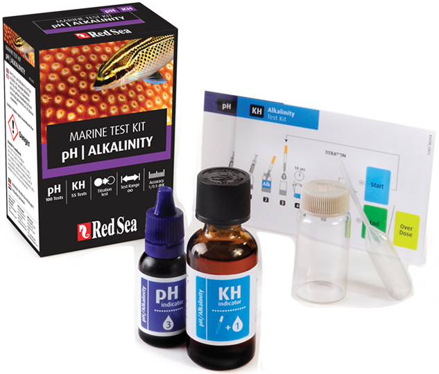 红海pH/碱度测试剂 – 这款二合一测试剂含有精确(1 dkH/0.36 meq/l)KH滴定测试剂,同时通过pH比色测试以监控海水水族箱中的基本参数。