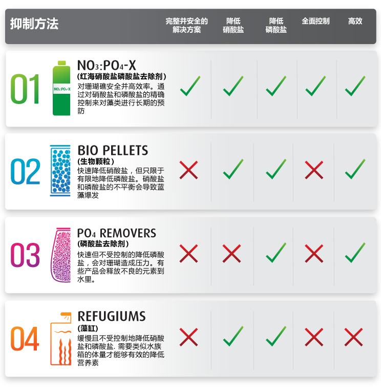 红海的NO3: PO4-X藻类控制系统提供了一套完整的解决方案。因为它让硝酸盐和磷酸盐得到可控和处理。相比较之下,其它方法在处理过程中欠缺某些部分。以下表格是目前用来处理硝酸盐或磷酸盐所使用的方法供您参考:阅读更多.